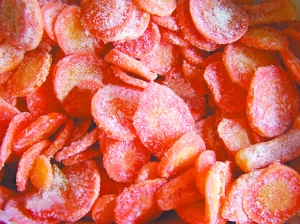 待胡蘿卜蜜餞冷卻至60℃時(shí),拌上糖粉即成。